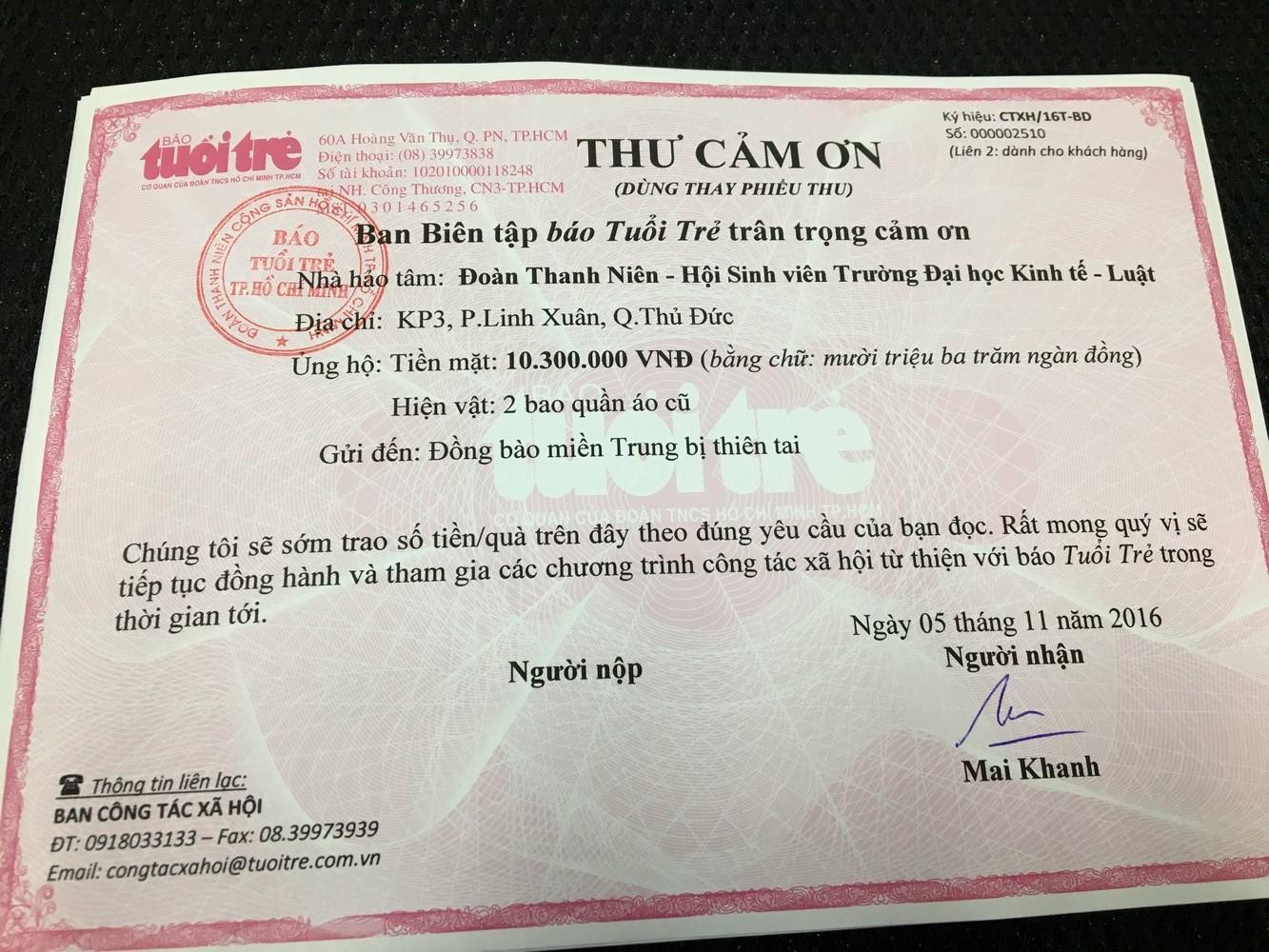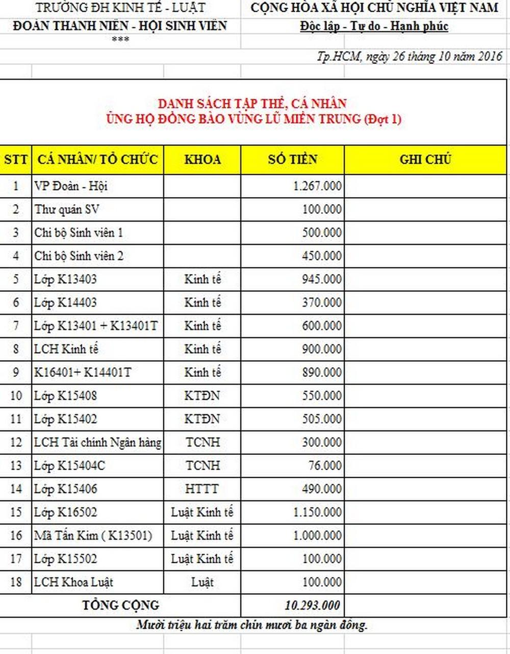 Hiện nay, VP Đoàn - Hội vẫn tiếp tục tiếp nhận đóng góp của bạn sinh viên, đơn vị đến hết ngày 10/11/2016.