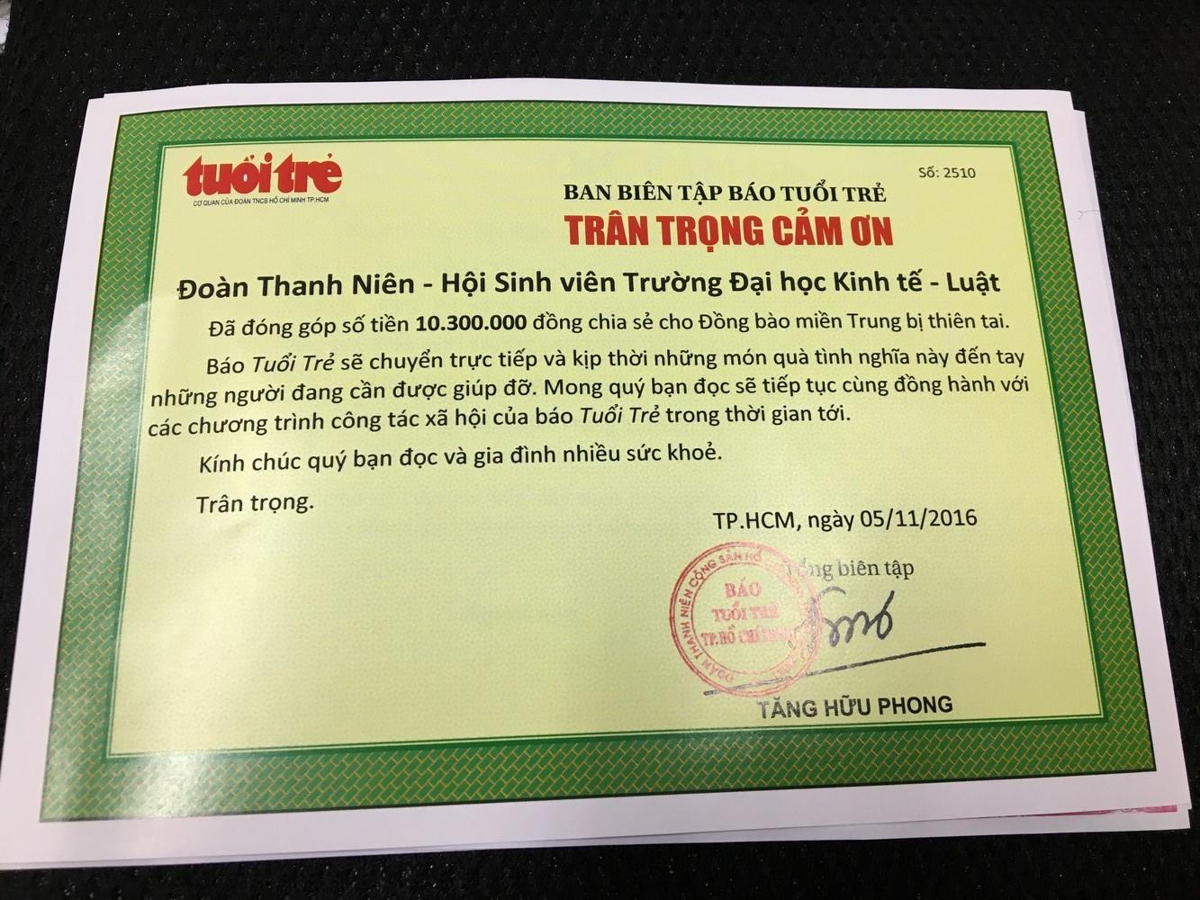 Sinh viên Trường Đại học Kinh tế - Luật ủng hộ đồng bào vũng lũ miền Trung