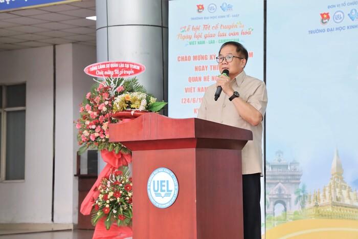 Cũng tại ngày hội ông Amphay Souvannaseng - Phó Tổng Lãnh sự quán nước Cộng hòa dân chủ nhân dân Lào tại TP. HCM đã gửi lời chúc mừng năm mới đến các bạn du học sinh Lào, Campuchia đang sinh sống và làm việc trên địa bàn TP.HCM và lời cảm ơn sâu sắc đến Trường Đại học Kinh tế - Luật, ĐHQG-HCM đã tổ chức cho sinh viên Lào đang học tập xa nhà có điều kiện đón Ngày hội năm mới này.