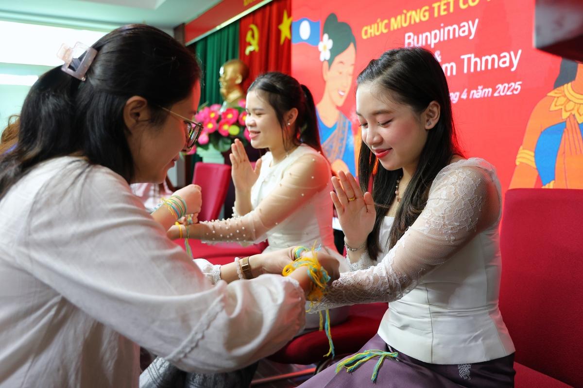 Nghi thức buộc chỉ tay trong Tết cổ truyền Lào - Campuchia được thực hiện ngay tại UEL, cầu chúc bình an, hạnh phúc cho mọi người