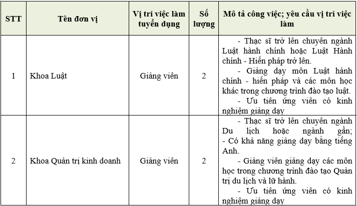 - Trường hợp từ 02 người trở lên có kết quả điểm thi vòng 2 cộng với điểm ưu tiên (nếu có) bằng nhau ở chỉ tiêu cuối cùng cần tuyển dụng thì người có kết quả điểm thi vòng 2 cao hơn là người trúng tuyển; trường hợp vẫn không xác định được thì Hiệu trưởng quyết định việc trúng tuyển.