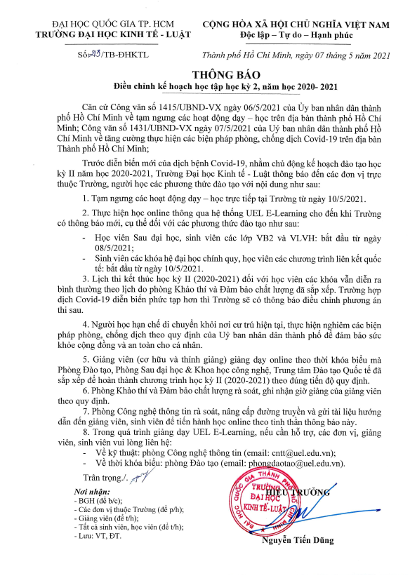 Phòng Tổ chức - Hành chính kính gửi Thông báo số 213/TB-ĐHKTL về việc điều chỉnh kế hoạch học tập học kỳ 2, năm học 2020-2021.