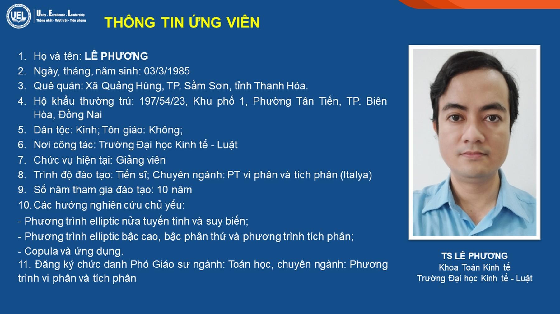 - TS Lê Phương, Trường Đại học Kinh tế - Luật xét công nhận đạt tiêu chuẩn chức danh Phó Giáo sư.