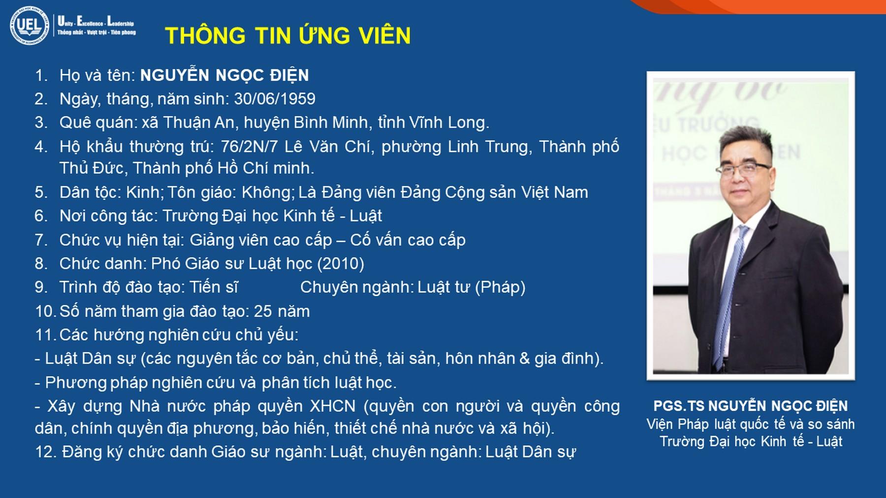 - PGS.TS Nguyễn Ngọc Điện, Trường Đại học Kinh tế - Luật xét công nhận đạt tiêu chuẩn chức danh Giáo sư.