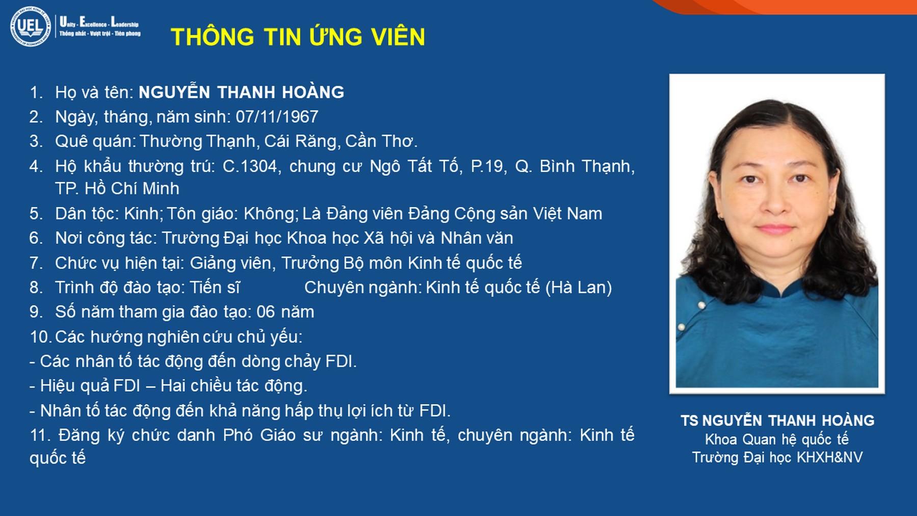 - TS Nguyễn Thanh Hoàng, Trường Đại học Khoa học Xã hội và Nhân văn xét công nhận đạt tiêu chuẩn chức danh Phó Giáo sư.