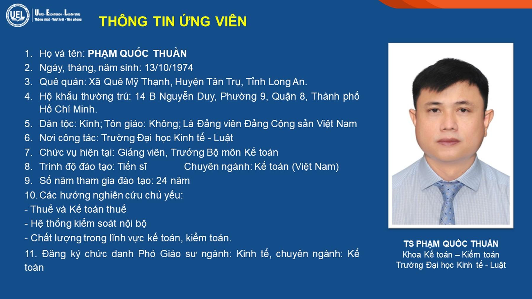 - TS Phạm Quốc Thuần, Trường Đại học Kinh tế - Luật xét công nhận đạt tiêu chuẩn chức danh Phó Giáo sư.