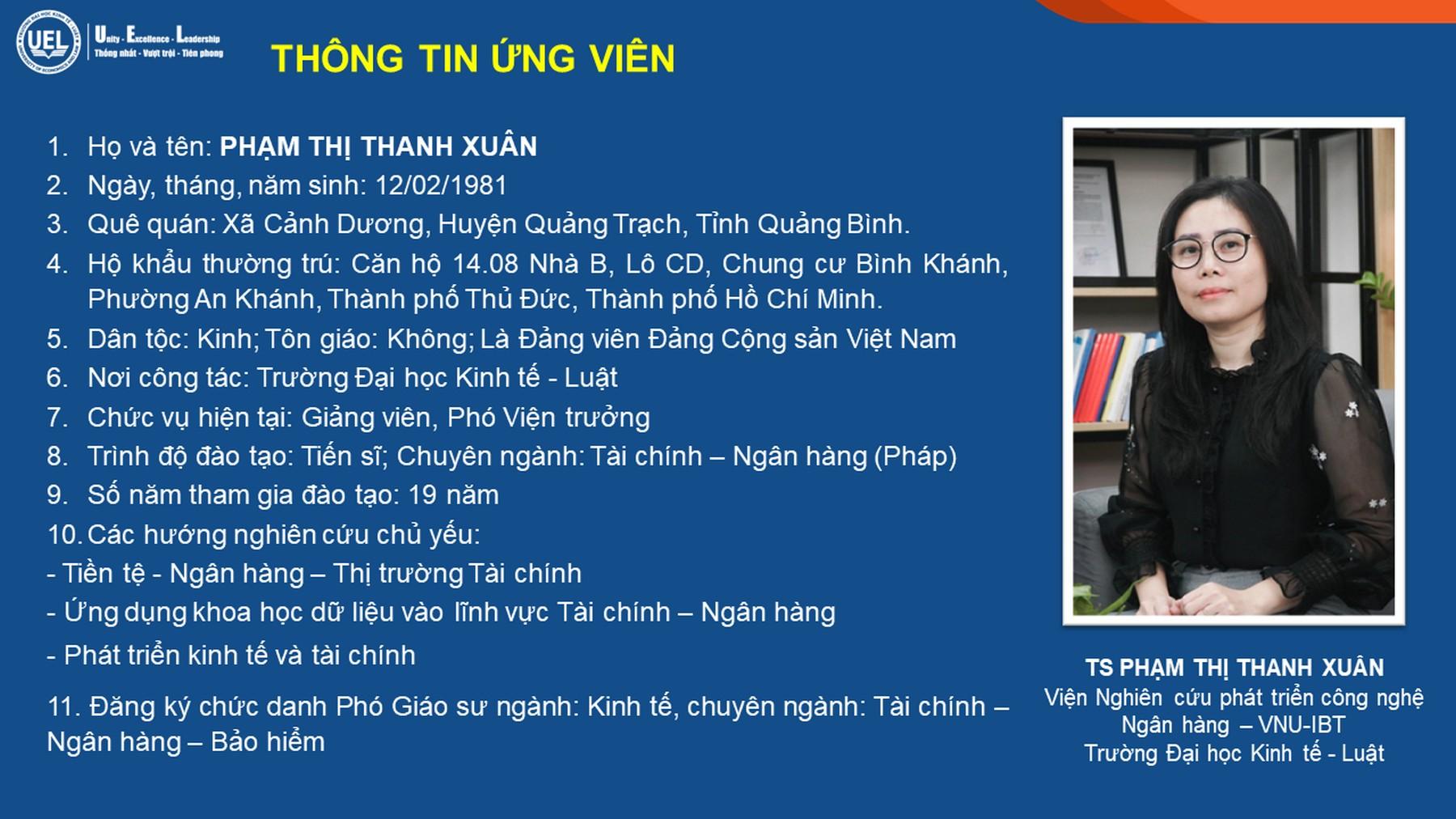 - TS Phạm Thị Thanh Xuân, Trường Đại học Kinh tế - Luật xét công nhận đạt tiêu chuẩn chức danh Phó Giáo sư.