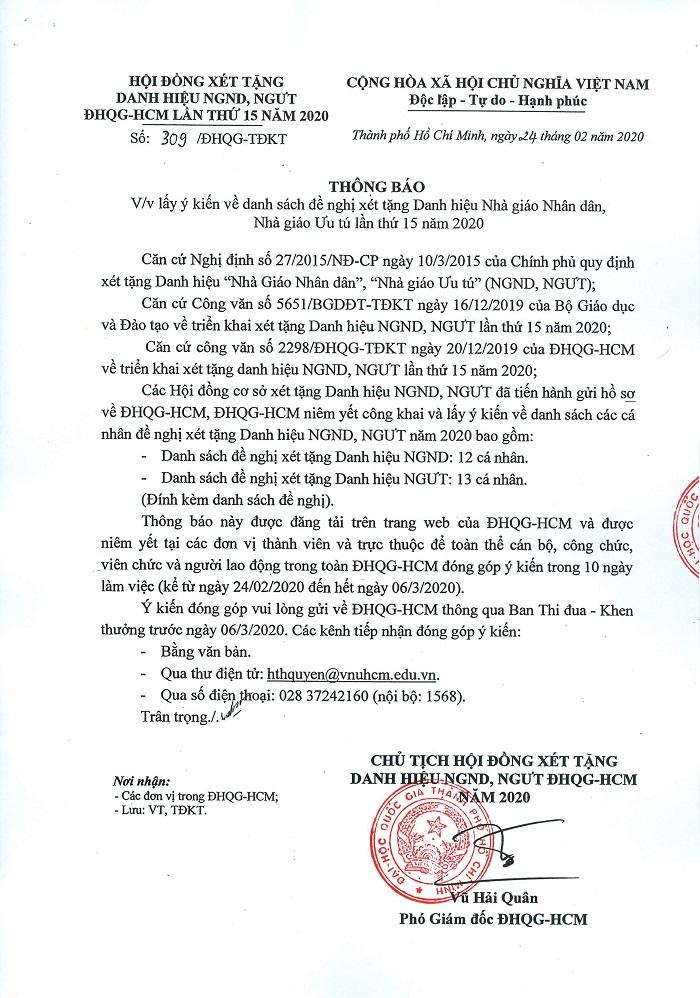 Thông Báo này đã được đăng tải trên trang web của ĐHQG-HCM và được niêm yết tại các đơn vị thành viên và trực thuộc để toàn thể cán bộ, công chức, viên chức và người lao động trong toàn ĐHQG-HCM đóng góp ý kiến trong 10 ngày làm việc (kể từ ngày 24/02/2020 đến 06/03/2020).