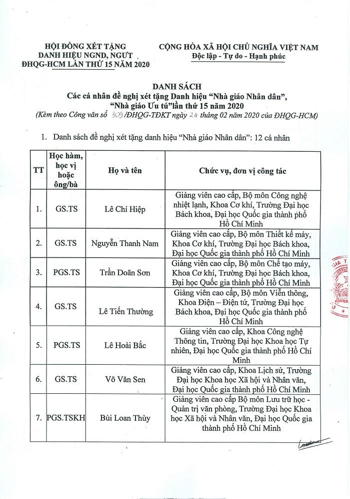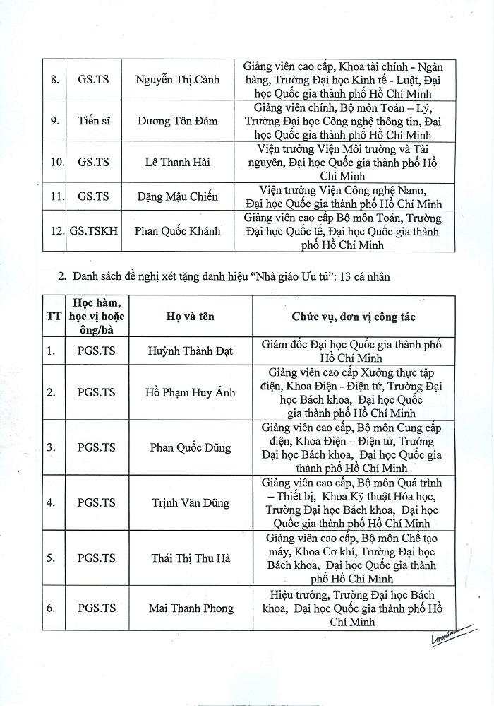 Đại học Quốc gia Thành phố Hồ Chí Minh (ĐHQG-HCM) vừa niêm yết công khai danh sách đề nghị xét tặng danh hiệu Nhà giáo Nhân dân (NGND), Nhà giáo Ưu tú (NGƯT) năm 2020 từ các Hội đồng cơ sở.