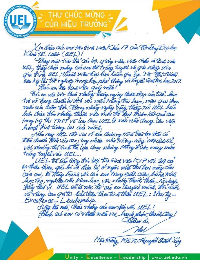 Trong thư, Thầy gửi những lời chúc tốt đẹp nhất đến tất cả Tân sinh viên K17, đồng thời nhắn nhủ với các em rằng: "UEL sẽ là nơi để các em chuyển mình, đổi mới và nâng cao giá trị bản thân theo tinh thần UEL: