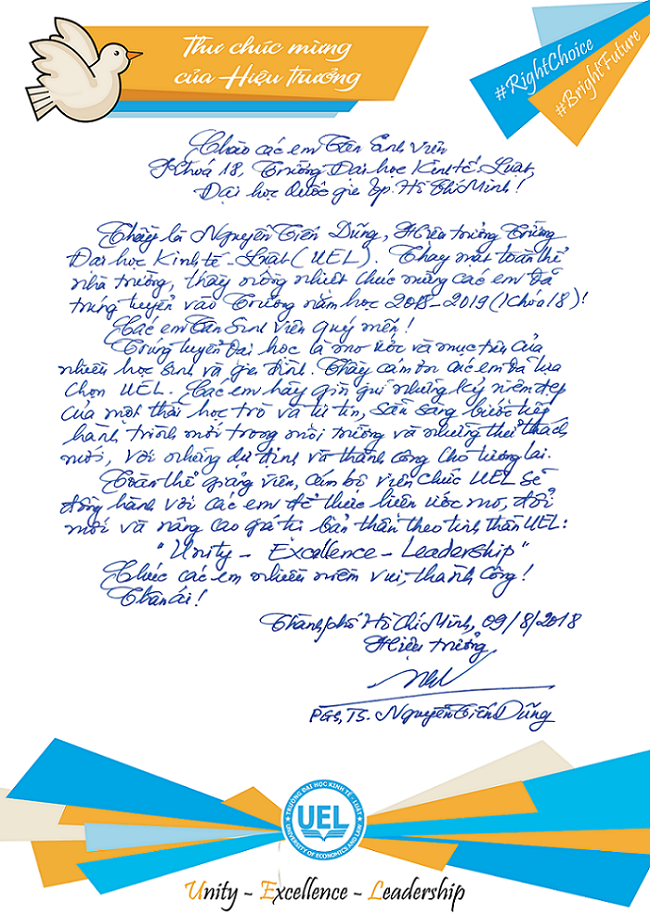 Thư chúc mừng của Thầy Hiệu trưởng Trường Đại học Kinh tế - Luật gửi Tân sinh viên Khóa 18