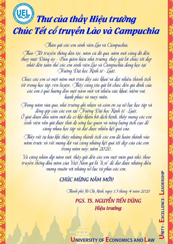 Thư chúc Tết cổ truyền Lào và Campuchia của Thầy Hiệu trưởng UEL