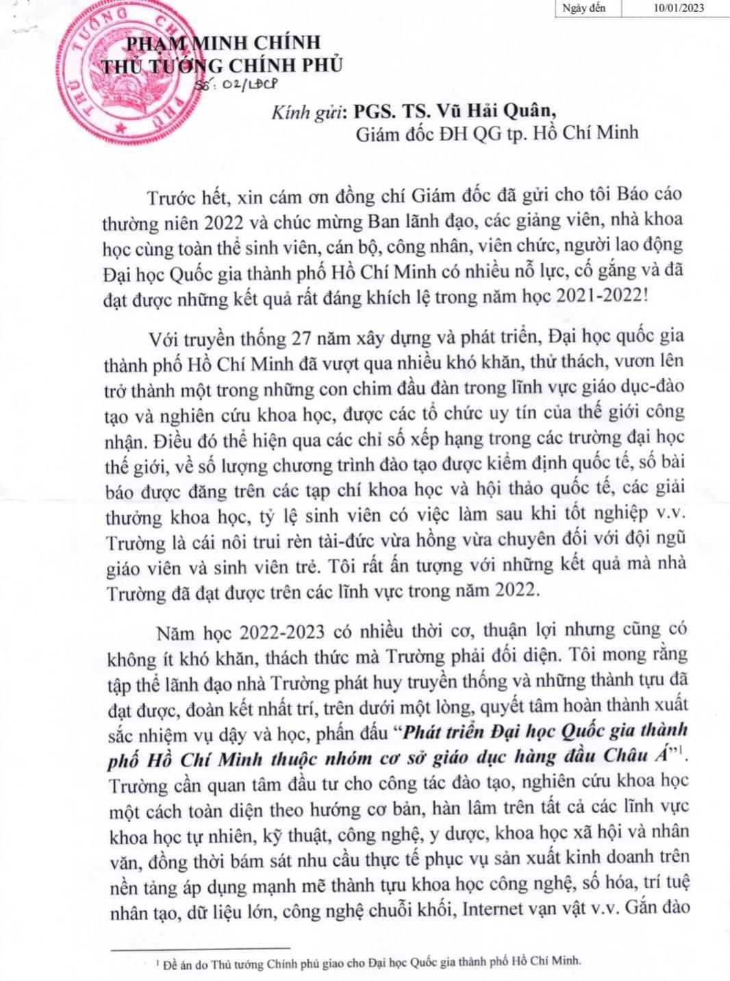Ngày 5/1, sau khi nhận được Báo cáo Thường niên năm 2022 của ĐHQG-HCM, Thủ tướng Chính phủ Phạm Minh Chính đã gửi thư chúc mừng và ghi nhận những nỗ lực và thành tựu của ĐHQG-HCM trong suốt quá trình phát triển, đặc biệt là những kết quả của thầy trò ĐHQG-HCM đạt được trong năm học 2021-2022.