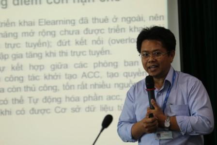 Sau phần phát biểu khai mạc của PGS.TS Nguyễn Tiến Dũng - Hiệu trưởng Trường Đại học Kinh tế - Luật, TS Lê Thanh Hưng - Phó Trưởng phòng Đào tạo Trường đại học Bách Khoa đã trình bày về những giải pháp kỹ thuật cho hệ thống hỗ trợ đào tạo trực tuyến.