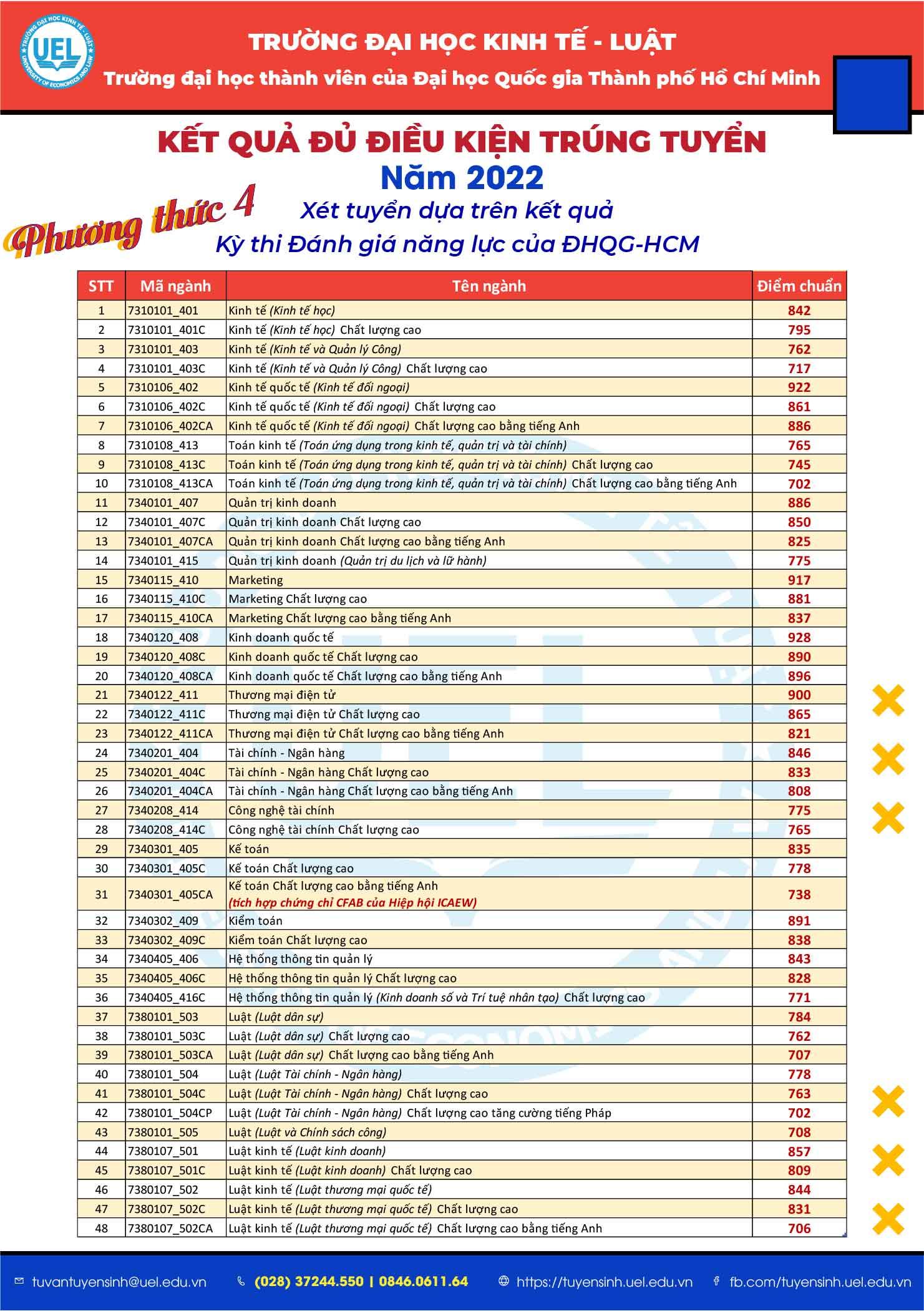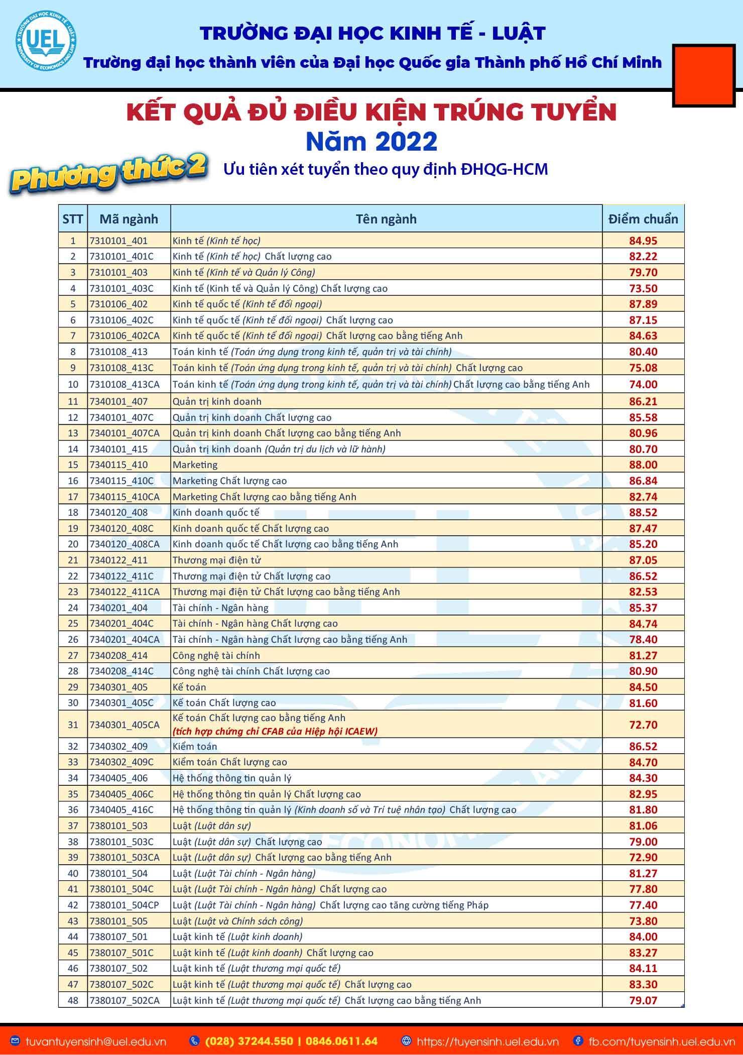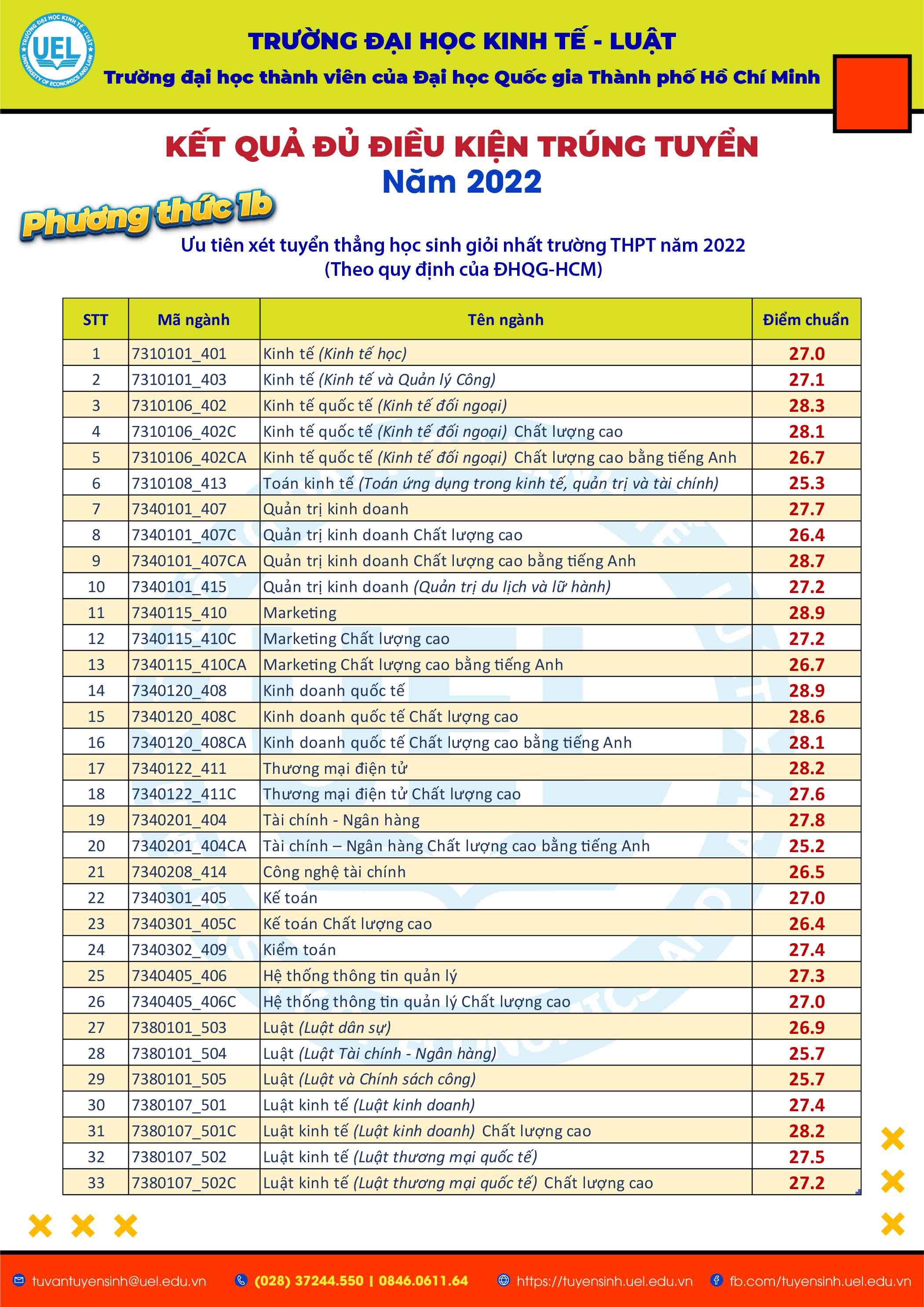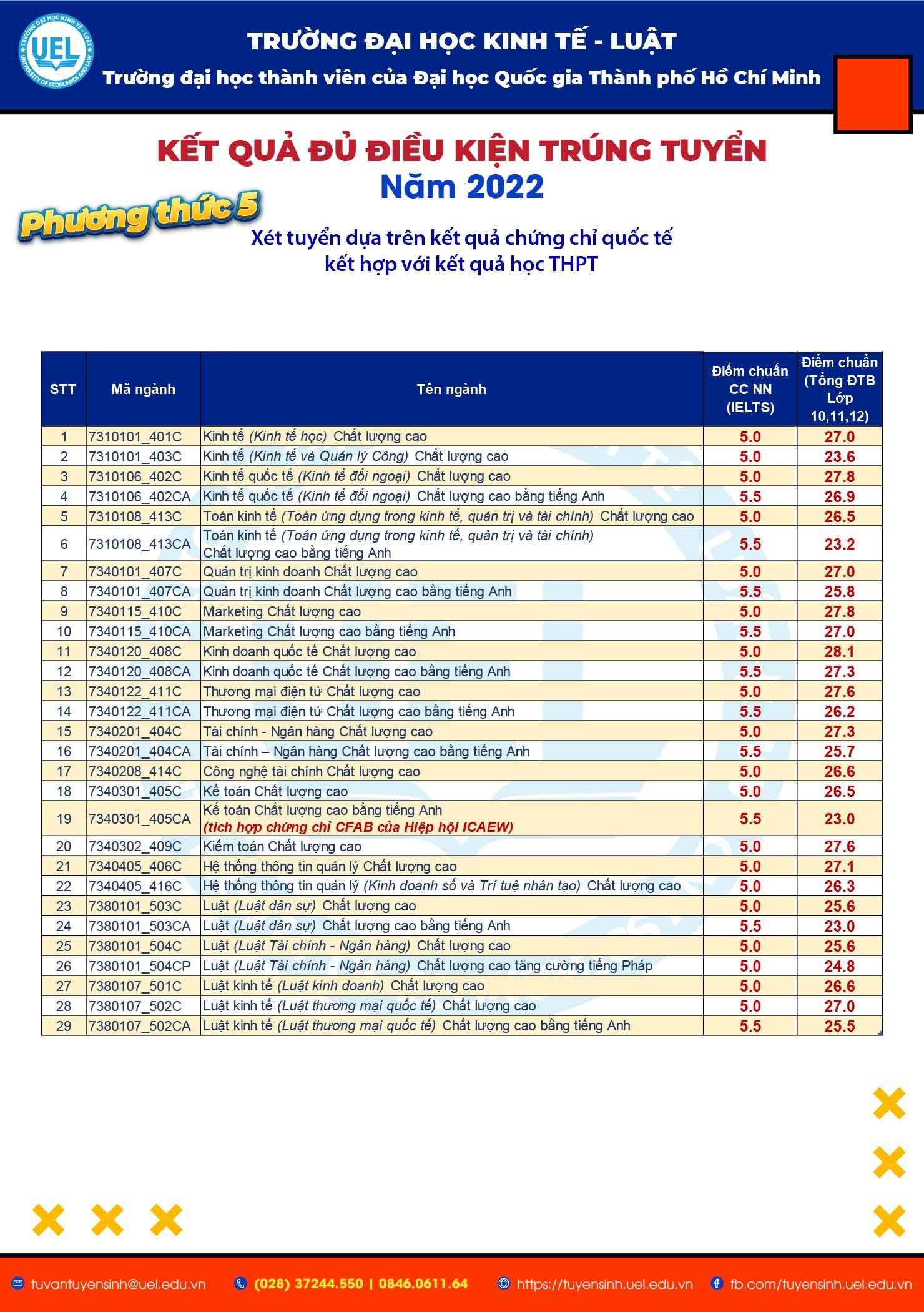 Vào lúc 17h30 ngày 30/6/2022, Trường Đại học Kinh tế - Luật (UEL) đã công bố kết quả đủ điều kiện trúng tuyển đại học chính quy năm 2022 theo các Phương thức 1b: Ưu tiên xét tuyển thẳng học sinh giỏi nhất của các trường THPT cả nước theo quy định của ĐHQG-HCM, Phương thức 2: Ưu tiên xét tuyển theo quy định của ĐHQG-HCM, Phương thức 4: Xét tuyển bằng kết quả Kỳ thi Đánh giá năng lực của ĐHQG-HCM năm 2022 và Phương thức 5: Xét tuyển dựa trên kết quả chứng chỉ quốc tế kết hợp với kết quả học bạ THPT đối với học sinh Việt Nam và học sinh có quốc tịch nước ngoài.
