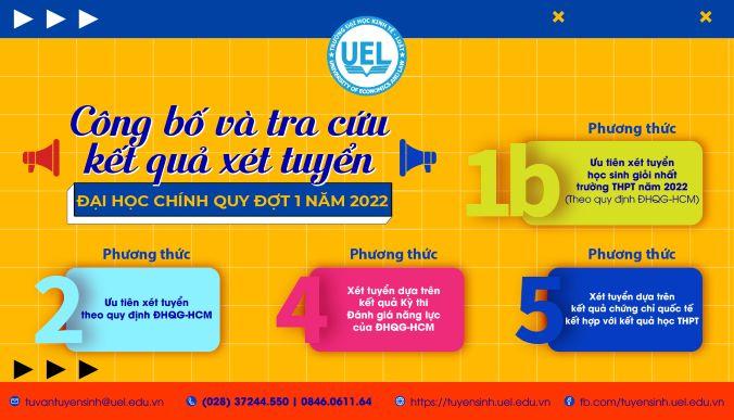 Thí sinh có thể tra cứu kết quả đủ điều kiện trúng tuyển (trừ tốt nghiệp THPT), chương trình trúng tuyển và hướng dẫn xác nhận nhập học tại Website tuyển sinh của trường: https://kqts.uel.edu.vn hoặc liên hệ điện thoại: 028 372.44.551 | 0846.0611.64 để biết thêm chi tiết. Thí sinh chính thức trúng tuyển khi được công nhận tốt nghiệp THPT năm 2022, riêng thí sinh trúng tuyển phương thức 2 chỉ đủ điều kiện trúng tuyển khi điểm thi tốt nghiệp THPT của các môn có trong tổ hợp môn mà thí sinh đã đăng ký xét tuyển phải đạt ngưỡng đảm bảo chất lượng đầu vào (lấy điểm thi THPT 2022 theo các môn có trong tổ hợp xét tuyển). Danh sách đủ điều kiện trúng tuyển sẽ được nhà trường cập nhật lên cổng thông tin của Bộ Giáo dục và Đào tạo. Thí sinh theo dõi thông báo hướng dẫn của Trường (được gửi qua tin nhắn SMS theo số điện thoại thí sinh đã đăng ký trong hồ sơ xét tuyển), thực hiện đăng ký và sắp xếp nguyện vọng đúng theo quy chế tuyển sinh của Bộ Giáo dục và Đào tạo để được công nhận trúng tuyển chính thức. Lưu ý: nếu thí sinh nằm trong danh sách đủ điều kiện trúng tuyển và muốn nhập học ở phương thức nào thì đăng ký là "Nguyện vọng 1" trên cổng đăng ký xét tuyển đại học của Bộ Giáo dục và Đào tạo để đảm bảo trúng tuyển vào UEL. Thời gian thực hiện đăng ký xét tuyển nguyện vọng trên Cổng thông tin của Bộ Giáo dục và Đào tạo: từ ngày 22/7/2022 đến 17h00 ngày 20/8/2022.