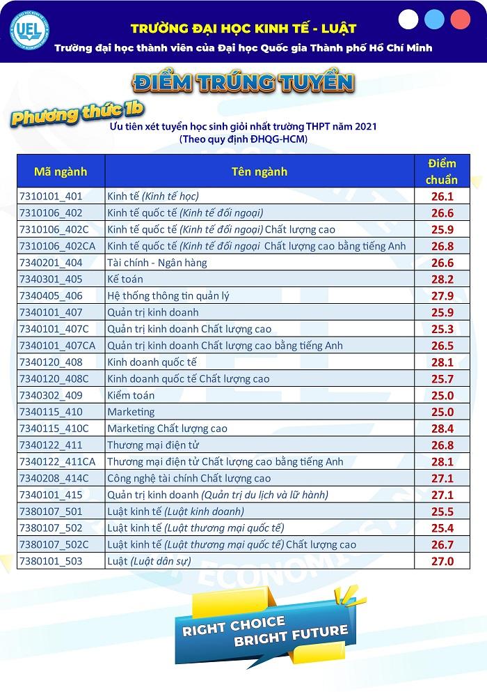 Phương thức 1b: ưu tiên xét tuyển thẳng học sinh giỏi nhất trường THPT (mỗi trường một thí sinh) theo quy định của ĐHQG-HCM. Đây là năm đầu tiên Trường Đại học Kinh tế - Luật xét tuyển theo phương thức này và nhận được sự quan tâm của thí sinh với 237 nguyện vọng đăng ký xét tuyển. Ở phương thức này chương trình đào tạo Marketing chất lượng cao có điểm trúng tuyển cao nhất với 28,4 điểm (là điểm trung bình học tập 03 năm THPT).
