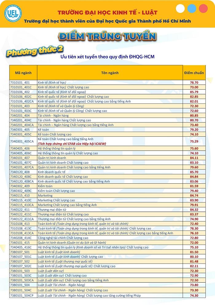 Kết quả xét tuyển theo các phương thức 01, 02, 05 thí sinh vui lòng tra cứu TẠI ĐÂY hoặc liên hệ https://fb.com/tuyensinh.uel.edu.vn, điện thoại: 028 37244550 | 0846.0611.64 để biết thêm chi tiết.