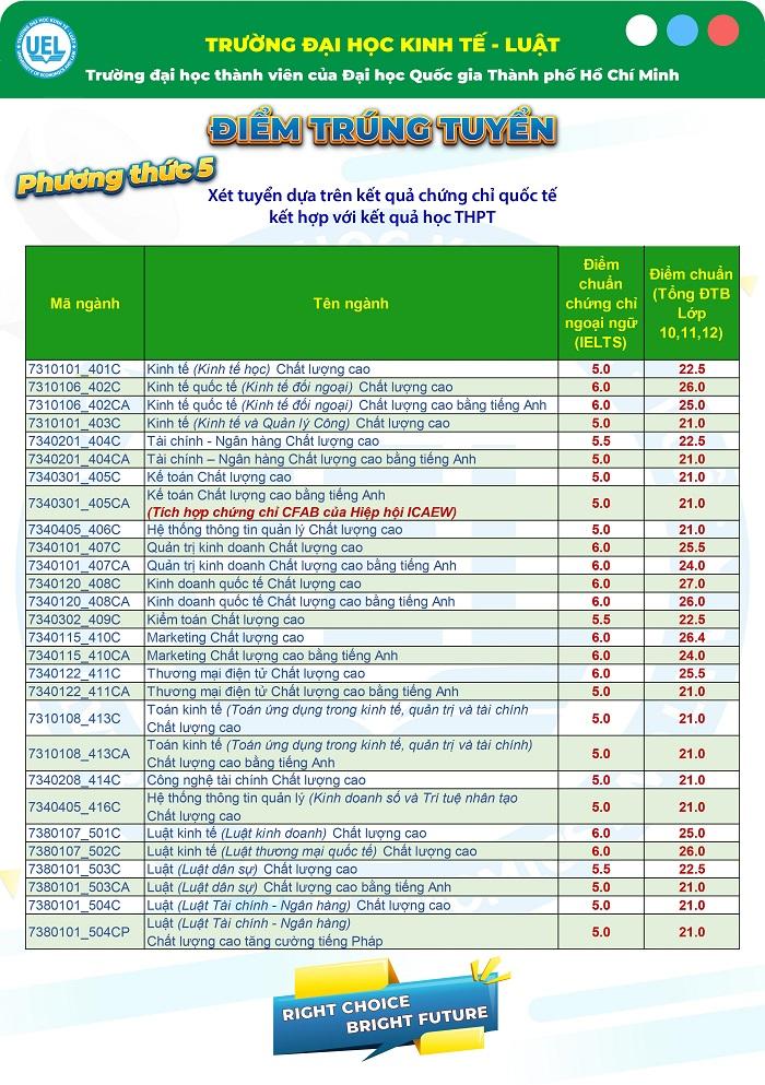 Phương thức 05: xét tuyển dựa trên kết quả chứng chỉ quốc tế (IELTS, TOEFL, SAT, ACT, DELF,…) kết hợp với kết quả học THPT đối với học sinh Việt Nam và học sinh có quốc tịch nước ngoài (học chương trình THPT quốc tế bằng tiếng Anh hoặc chương trình THPT trong nước). Đây là năm thứ ba UEL xét tuyển phương thức này với tối đa 20% tổng chỉ tiêu của các chương trình Chất lượng cao và không quá 50% tổng chỉ tiêu của các Chất lượng cao tăng cường tiếng Pháp, Chất lượng cao bằng tiếng Anh. Ở phương thức này nhà trường nhận được 1.623 nguyện vọng đăng ký xét tuyển tập trung vào các chương trình đào tạo như: Kinh doanh quốc tế chất lượng cao, Kinh doanh quốc tế chất lượng cao bằng tiếng Anh và Kinh tế đối ngoại chất lượng cao. Chứng chỉ quốc tế cao nhất ở phương thức này là chứng chỉ IELTS 8.0, SAT 1470 và DELF B2 54.5. Đặc biệt số hồ sơ có chứng chỉ IELTS 6.5 trở lên nộp vào Trường chiếm 42,14% tổng số lượng hồ sơ xét tuyển. Để trúng tuyển bằng phương thức này thí sinh cần có chứng chỉ IELTS từ 5.0 đến 6.0 và tổng điểm trung bình học tập trung học phổ thông trong 3 năm từ 21 điểm trở lên.