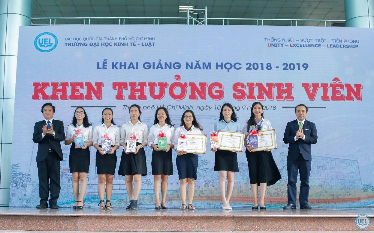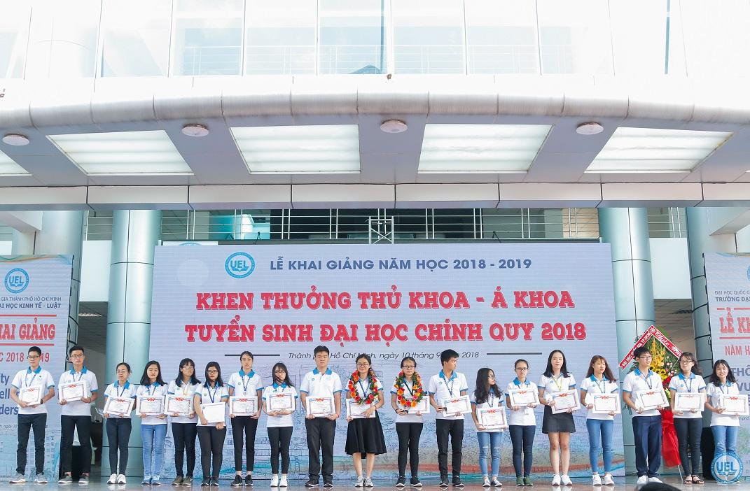 Tại buổi lễ, PGS.TS Vũ Hải Quân - Phó Giám đốc ĐHQG TP.HCM đã khen thưởng cho các đội tuyển sinh viên và sinh viên đạt thành tích cao trong hoạt động học thuật và phong trào; Ban Giám hiệu nhà trường khen thưởng cho các thủ khoa Trường và các thủ khoa ngành trong đợt tuyển sinh đại học 2018 cùng các nhóm sinh viên đạt thành tích cao tại các cuộc thi quốc tế.