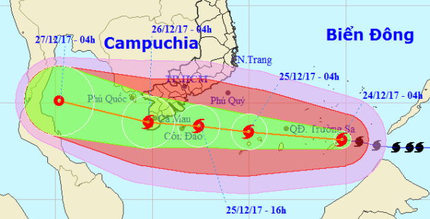 Đến 16h chiều ngày 25/12, dự đoán bão ở ngay trên vùng biển các tỉnh từ Bà Rịa-Vũng Tàu đến Cà Mau. Sức gió mạnh nhất ở vùng gần tâm bão mạnh cấp 11 (100-115km/giờ), giật cấp 14, sóng biển cao từ 8-10 mét.