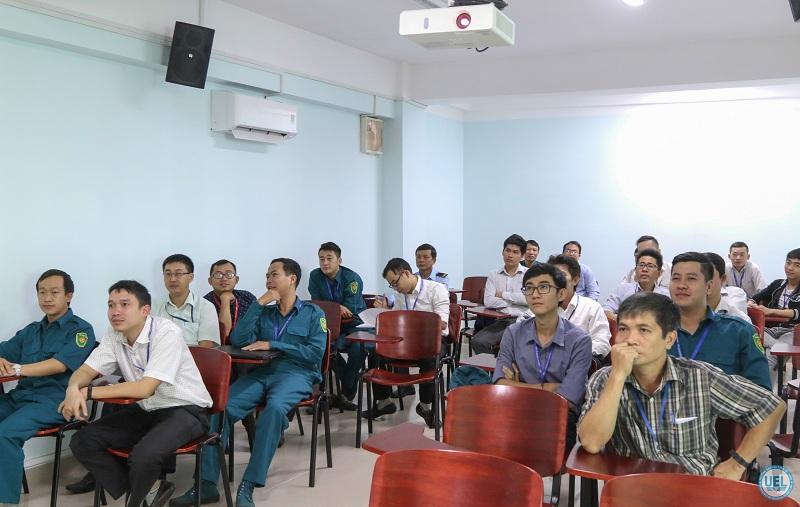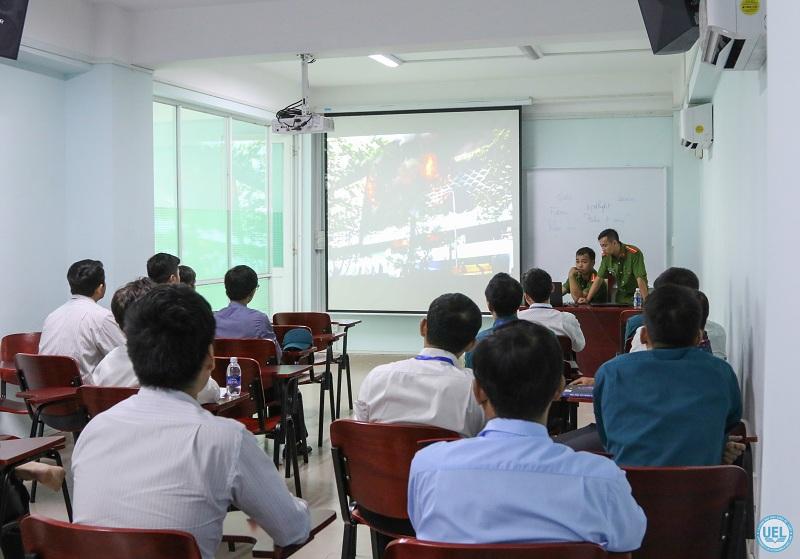 Ở phần lý thuyết, các cán bộ, viên chức Trường Đại học Kinh tế - Luật được phổ biến kiến thức về phòng cháy chữa cháy (PCCC), xem hình ảnh tư liệu một số vụ cháy tại phòng họp hoặc hội trường, giới thiệu một số động tác cứu người bị nạn trong đám cháy…