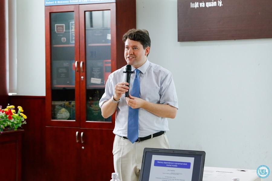 Với chủ đề này, Seminar được dẫn dắt bởi bài trình bày của GS John Appleby, chuyên gia về toán tài chính đến từ Trường Đại học Dublin Ciy, Ireland. Giáo sư đã cung cấp và truyền đạt đến các giảng viên, nhà nghiên cứu và sinh viên một số nghiên cứu của ông về mô hình toán học ứng dụng trong tài chính và thị trường chứng khoán.