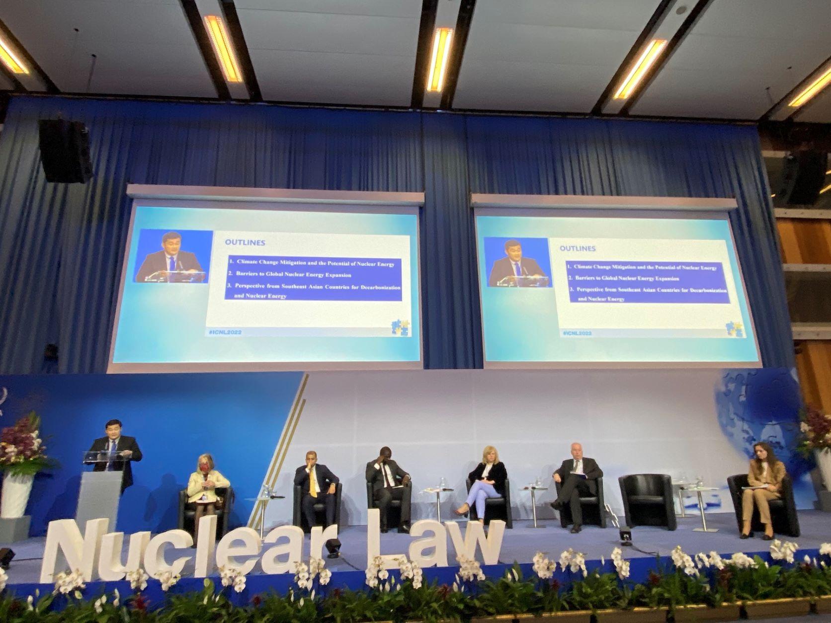 Trong quá trình tham luận, Việt Nam đánh giá cao ý nghĩa của Hội nghị Luật hạt nhân lần đầu tiên được IAEA tổ chức, đồng thời nhấn mạnh cần làm rõ triển vọng, xu hướng ứng dụng và các vấn đề pháp lý trong điều chỉnh việc ứng dụng các công nghệ hạt nhân mới, trong đó có công nghệ lò phản ứng hạt nhân mô-đun nhỏ (SMR), nhà máy điện hạt nhân nổi (FNPP).