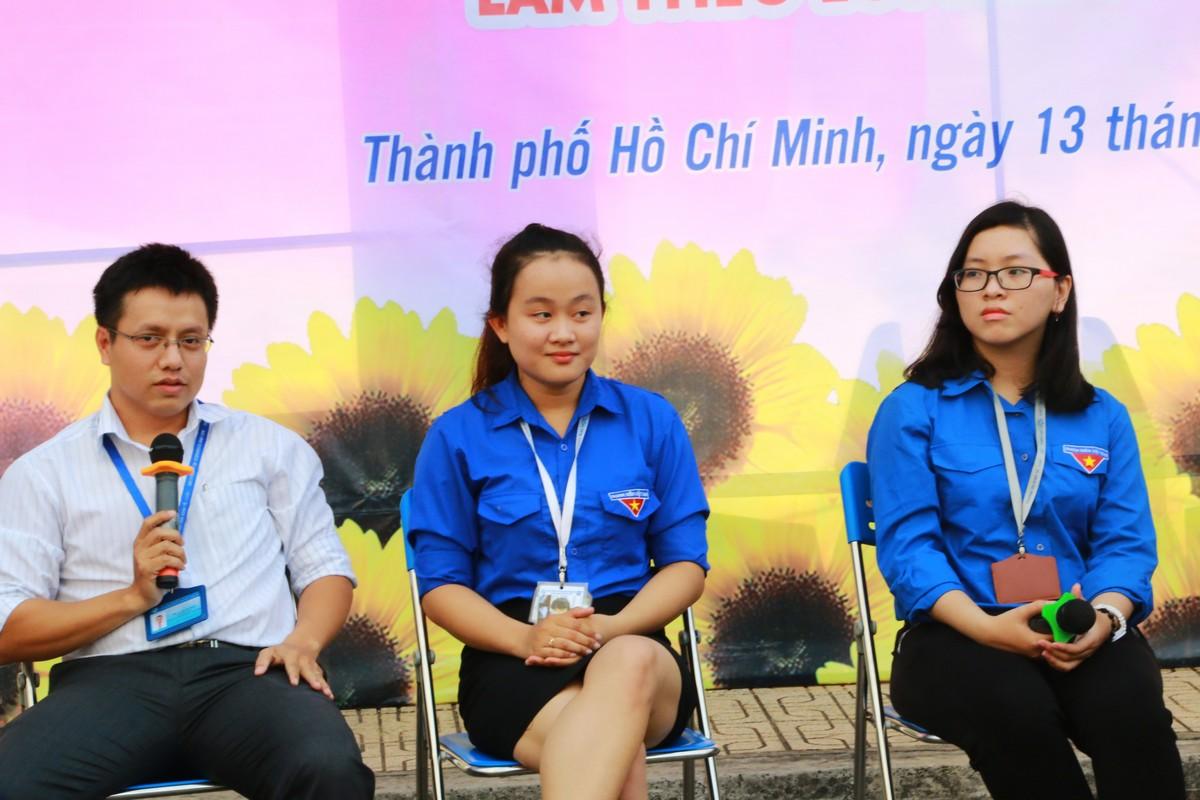 Đại biểu tham dự cùng lắng nghe phần giao lưu với 03 điển hình làm theo lời Bác năm 2016: Anh Cù Xuân Tiến - Phó Trưởng Phòng Đào tạo, Cán bộ Công chức trẻ - giỏi - thân thiện cấp Thành, Đ/c Nguyễn Trương Lê Trà - Ủy viên BTV Đoàn Khoa Kinh tế, Giải nhất cuộc thi Thủ lĩnh cán bộ Đoàn - Hội năm 2015 và Bạn Đào Minh Châu - Sinh viên lớp K13504 Khoa Luật, sinh viên 5 Tốt cấp TPHCM năm 2015