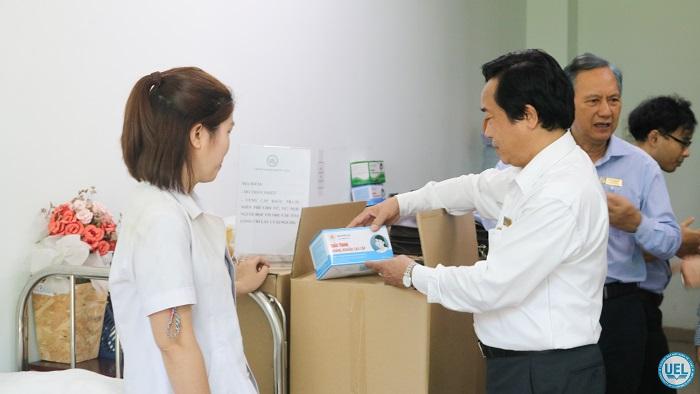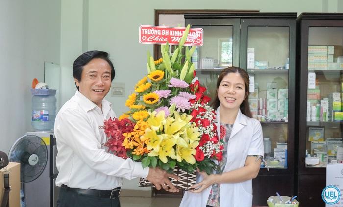 PGS.TS Nguyễn Tiến Dũng - Bí thư Đảng ủy, Hiệu trưởng Trường Đại học Kinh tế - Luật tặng hoa và gửi lời chúc mừng đến bộ phận Y tế của Nhà trường