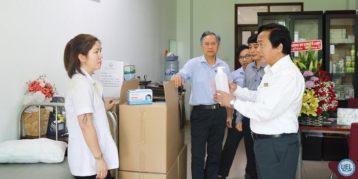 PGS.TS Nguyễn Tiến Dũng kiểm tra lại việc chuẩn bị khẩu trang y tế và nước rửa tay trước khi đón sinh viên trở lại Trường.