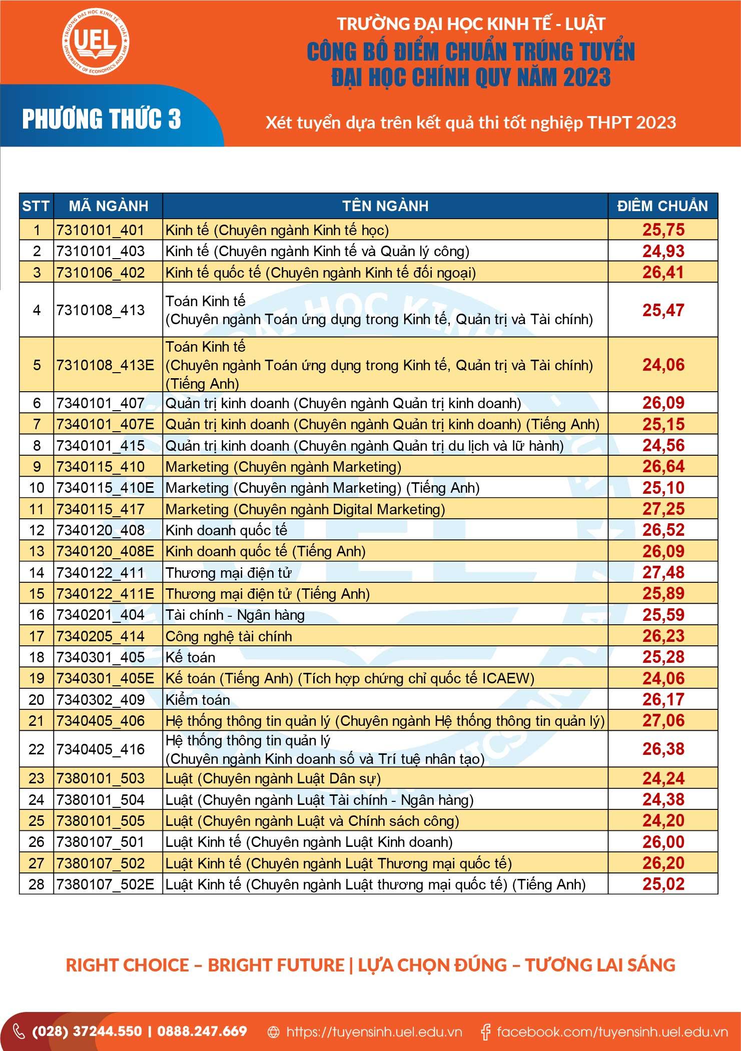 Vào lúc 15h15 ngày 22/8/2023, Trường Đại học Kinh tế - Luật, Đại học Quốc gia TP.HCM (UEL) đã công bố kết quả trúng tuyển đại học chính quy năm 2023 theo phương thức 3 (xét tuyển dựa trên kết quả thi tốt nghiệp THPT 2023).