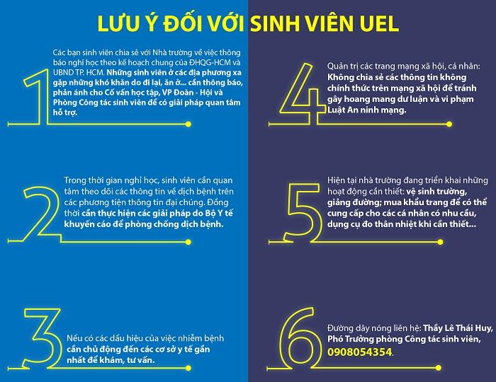 1. Các bạn sinh viên chia sẻ với Nhà trường về việc thông báo nghỉ học theo kế hoạch chung của ĐHQG và UBND TP. HCM. Những sinh viên ở các địa phương xa gặp những khó khăn do đi lại, ăn ở... cần thông báo, phản ánh cho Cố vấn học tập, VP Đoàn - Hội và Phòng Công tác sinh viên để có giải pháp quan tâm hỗ trợ.