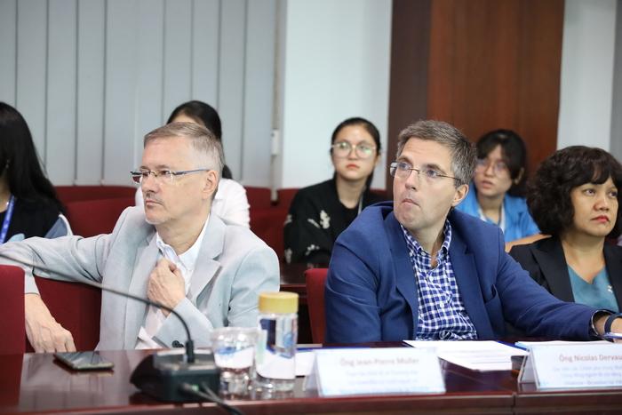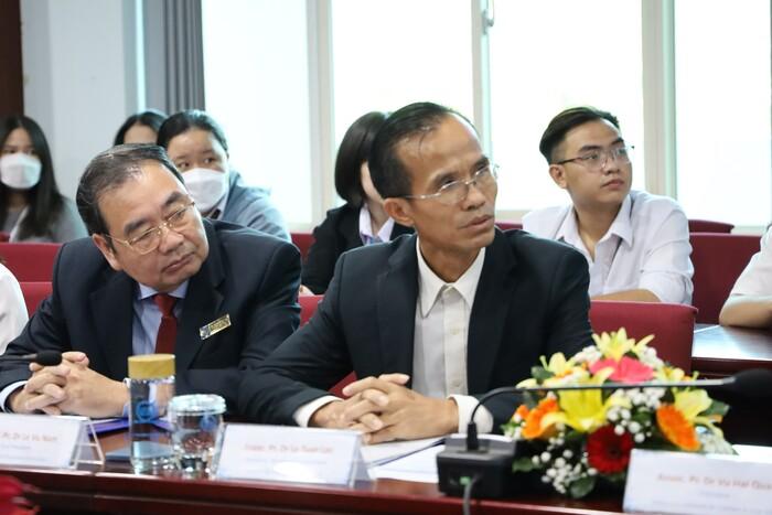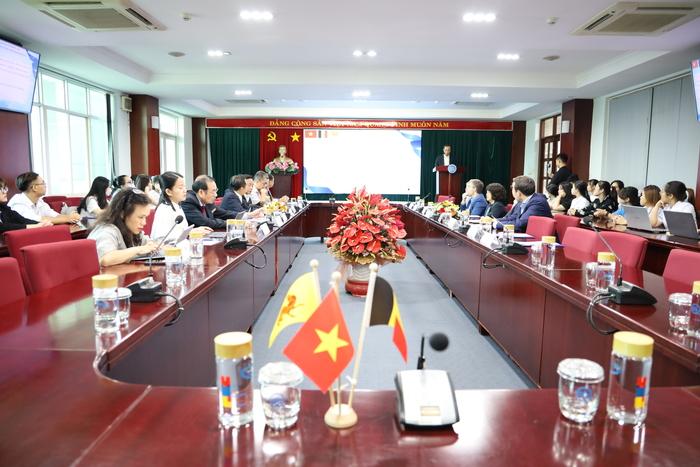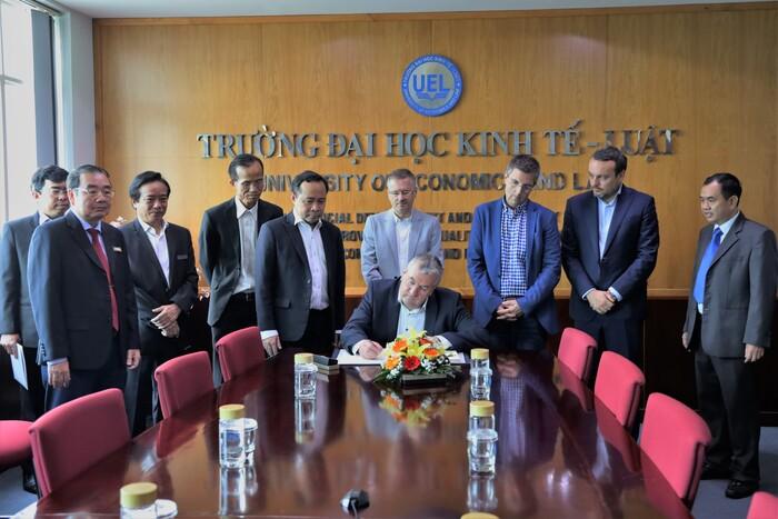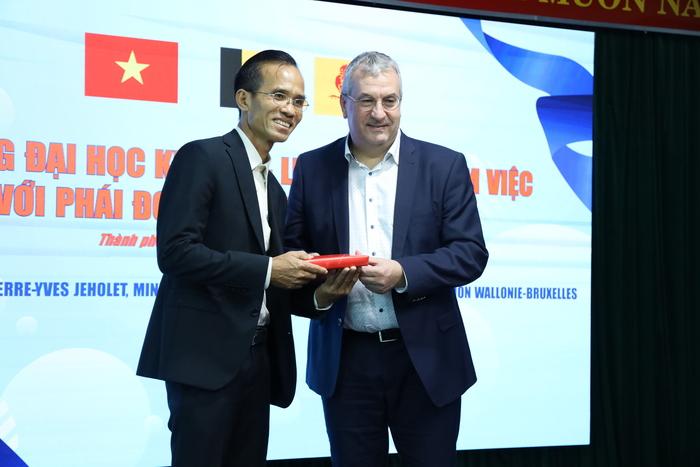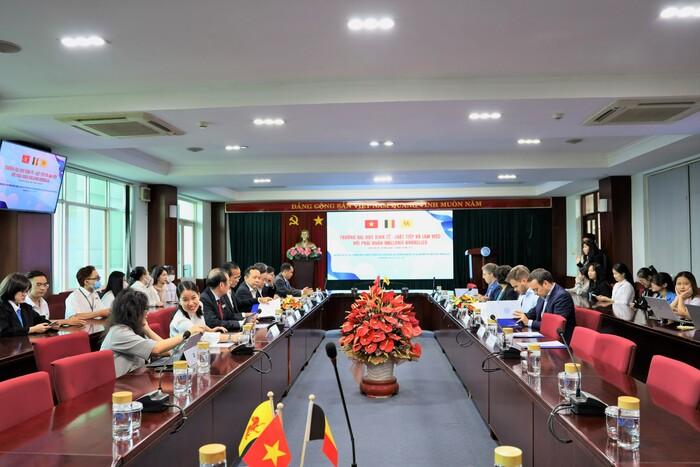 Tham dự buổi làm việc có sự tham gia của ông Pierre-Yves Jeholet - Bộ trưởng-Thủ hiến Wallonie-Bruxelles, PGS.TS Vũ Hải Quân - Giám đốc ĐHQG-HCM, PGS.TS Lê Tuấn Lộc - Chủ tịch Hội đồng Trường, PGS.TS Nguyễn Tiến Dũng - Nguyên Hiệu trưởng Trường, PGS.TS Lê Vũ Nam - Phó Hiệu trưởng Trường, PGS.TS Nguyễn Ngọc Điện - Nguyên Phó hiệu trưởng Trường cùng các cán bộ, giảng viên và sinh viên Trường Đại học Kinh tế - Luật.
