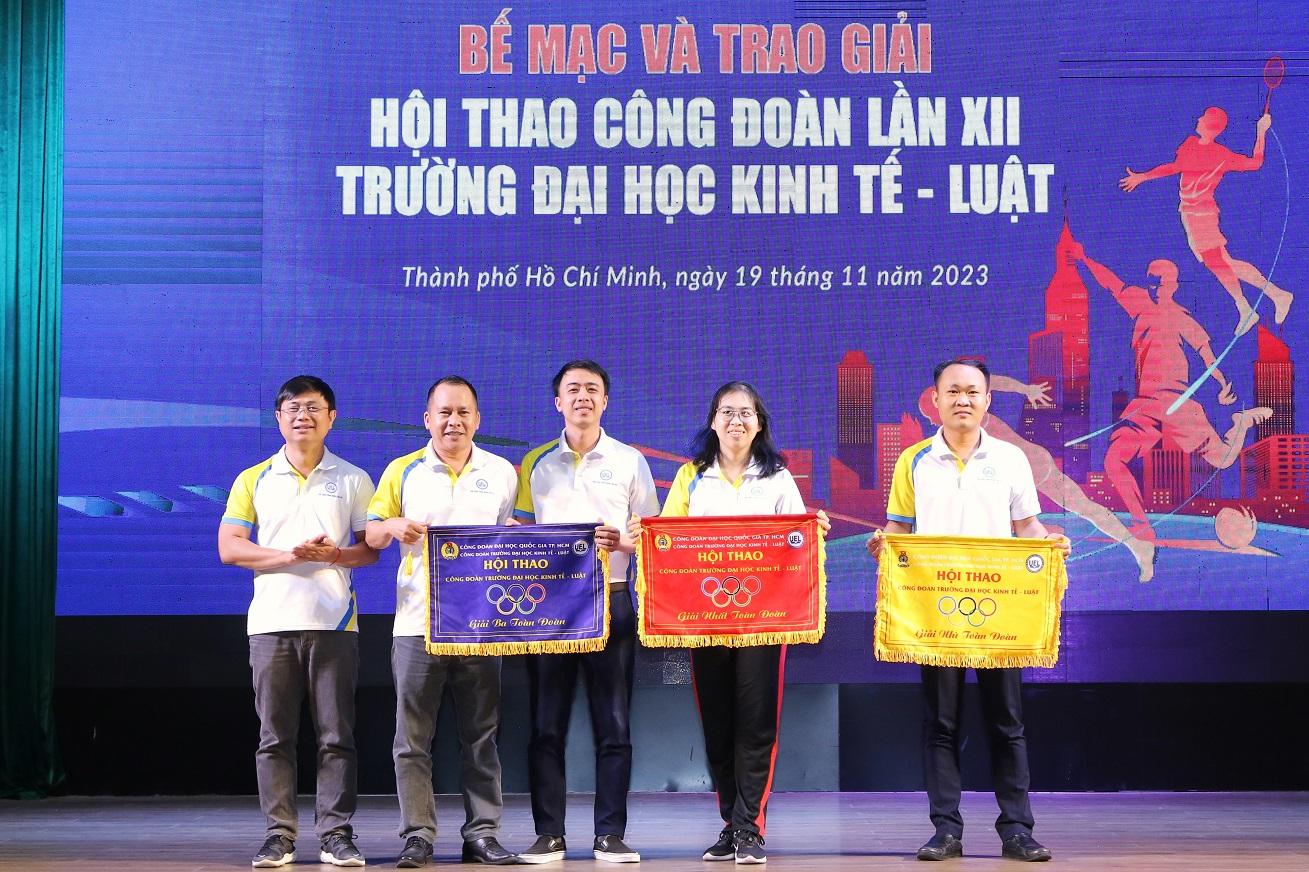 Tại buổi họp mặt, nhà trường cũng đã trao Kỷ niệm chương "Vì sự nghiệp giáo dục" của Bộ Giáo dục và Đào tạo cho 02 cá nhân của Trường; tổng kết và trao các giải thưởng Hội thao Công đoàn Trường năm 2023 cho các tập thể và cá nhân xuất sắc. Hội thao Công đoàn Trường Đại học Kinh tế - Luật năm 2023 là một trong những hoạt động chào mừng kỷ niệm 41 năm Ngày Nhà giáo Việt Nam, diễn ra từ 31/10 với nhiều môn thi hấp dẫn: bóng đá, chạy bộ, kéo co, quần vợt, E-sport, các môn cờ, cầu lông, bơi lội,…