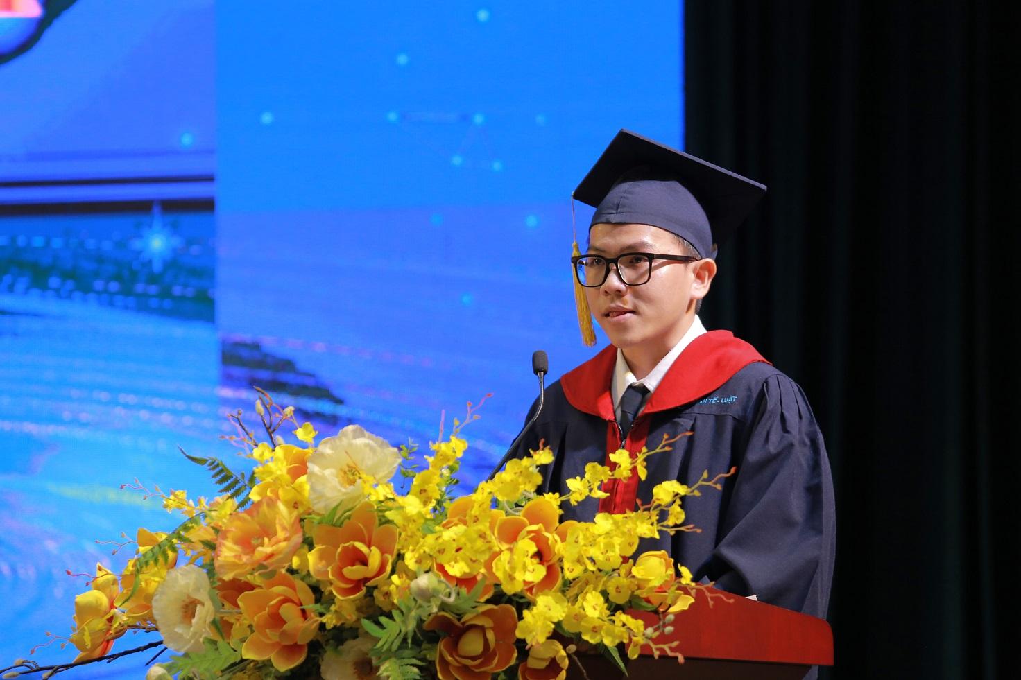 Tân cử nhân Lê Thanh Hải - Thủ khoa Trường phát biểu chia sẻ cảm xúc về quãng thời gian đại học