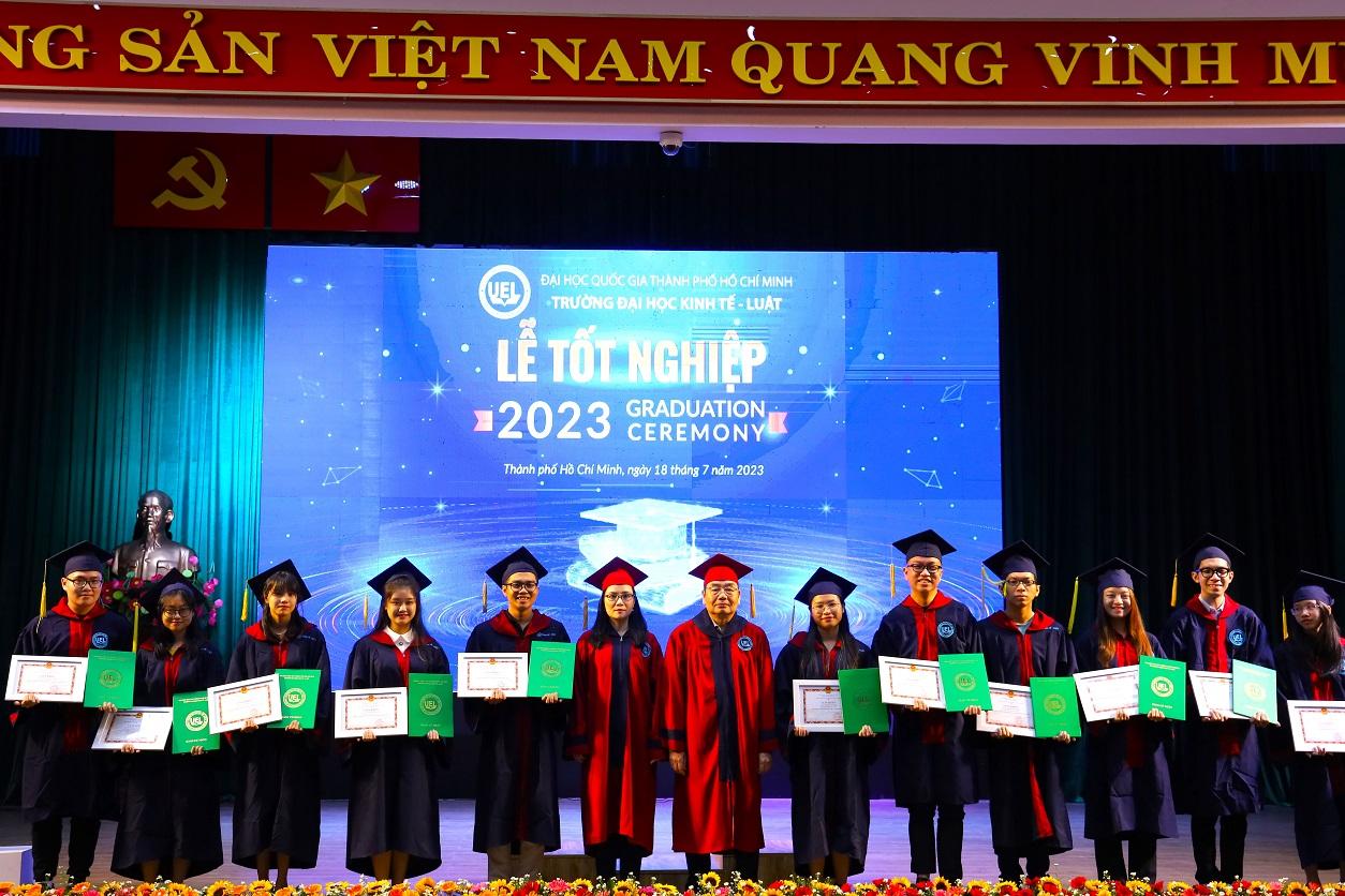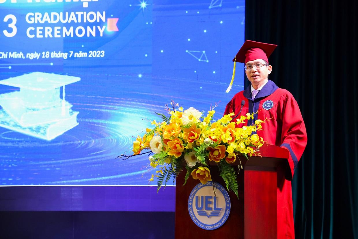 Phát biểu tại buổi lễ, PGS.TS Hoàng Công Gia Khánh - Hiệu trưởng chúc mừng các Tân cử nhân và nhắn gửi "Nhận bằng cử nhân là sự khởi đầu, chuyển tiếp sang một hành trình mới của cuộc đời, ở đó, các em phải có trách nhiệm nhiều hơn và đóng góp hữu ích hơn, đem lại nhiều giá trị hơn cho gia đình và xã hội. Nhận bằng tốt nghiệp của Trường Đại học Kinh tế - Luật đồng nghĩa với việc các em đã có đủ kiến thức, hiểu biết và năng lực để có thể lập nghiệp trong lĩnh vực chuyên môn mình được đào tạo, nhưng chỉ tri thức là chưa đủ, tri thức phải song hành cùng nhân cách và đạo đức, đó là điều quan trọng để các em có thể phát triển bản thân, đóng góp cho gia đình và góp phần cho sự tiến bộ của xã hội. Tương lai đang nằm trong tay các em và ít nhất phụ thuộc vào ba yếu tố của chính bản thân các em, thứ nhất là tình yêu thương và lòng trắc ẩn, thứ hai là đam mê, nghị lực và sự dấn thân và thứ ba là khả năng học tập suốt đời, tư duy đổi mới đế luôn tiến về phía trước". Đồng thời, Thầy cũng đã gửi lời tri ân đến phụ huynh, người thân của các Tân cử nhân đã đồng hành, hỗ trợ các em trong để có thành quả ngày hôm nay, và đã tin tưởng lựa chọn UEL là nơi trau dồi kiến thức, phát triển tương lai của con em mình.