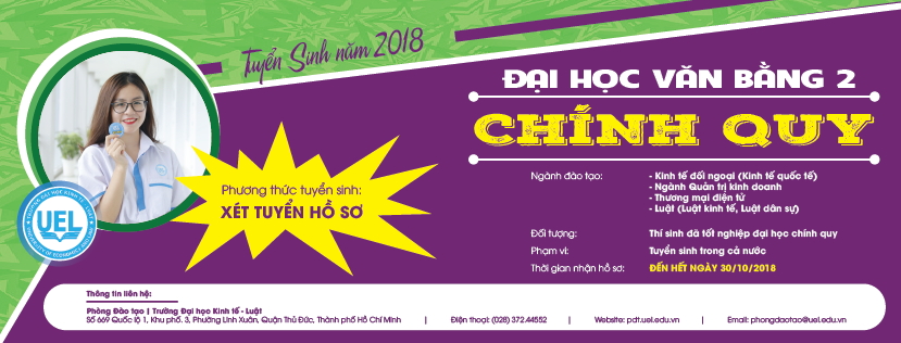 Trường Đại học Kinh tế - Luật thông báo tuyển sinh đại học văn bằng 2 hệ chính quy năm 2018 như sau:
